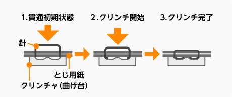 マガジンに装填された針はバネの力によって前方に押し出され、先頭の針はドライバ(針を押し下げる金属板)によって紙に打ち込まれます。針の先端は紙を通過しながらクリンチャ(曲げ台)にあたり、溝に沿って曲げられます。最後に、曲げられた針が紙に触れると、とじ込みは完了です。