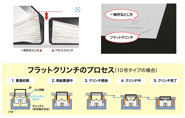 通常のクリンチの場合、とじた針の裏がめがね状になりますが(左図)、フラットクリンチ搭載のホッチキスを使うと、とじ裏が平らになります(下図)。これは、「重ねた書類がかさばるので、ホッチキスの裏をかなづちで潰している」というお客様の声をヒントにした、マックスによる世界初の技術です。針の裏が平らになることで、書類の雪崩も起きません。