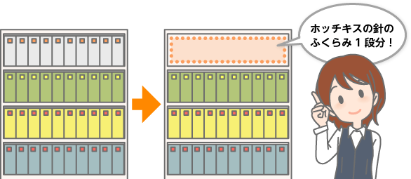 本当にスペースが減るのだろうかと半信半疑でとじ直していたそうですが、キャビネット1段に背幅83~85mmのファイル10冊、計4段のスペースを使用していたものが、3段に収まったとのこと!1段分のスペースのほとんどはホッチキス針のふくらみだったのですね。以来R社様ではフラットクリンチを定番のホッチキスとして使っていただいています。