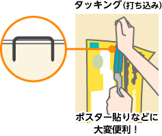 ホッチキスの針の出る部分を、壁やコルクボードに密着させて強く押し付けると、針は曲がらずに図の状態で打ち込まれます。このとじ機能を「タッキング」と言い、画鋲がわりになります。