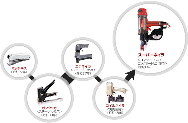 さらにガンタッカの展開として、圧縮した空気でステープルを打つネイラ(釘打機)を昭和37年(1962年)に開発し、新たに家具木工の市場へ参入しました。その後、ステープルから丸釘を打つネイラの開発が進み、現在ネイラは住宅建築の必需品となっています。文房具のホッチキスが、産業用の省力機器を生み出しました。それはマックスの歴史であり、新市場を新技術でひらくマックスの姿勢の現れでもあります。