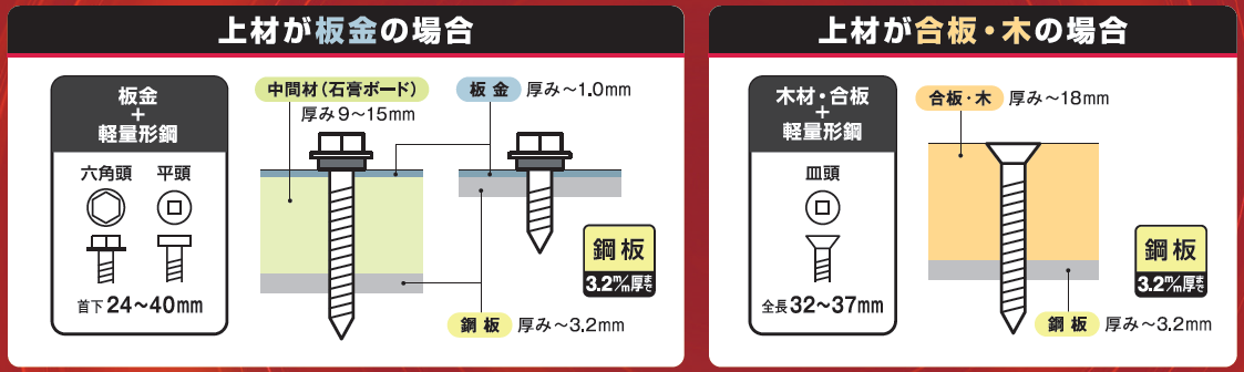 鉄骨造建築物の板金外壁施工や現場仮設事務所、倉庫などの軽量鉄骨建物を生産するユニットハウス工場においては、板金外壁や床合板を留め付ける際に、主にドリルねじが使用されています。ドリルねじは、ねじの先端が切り刃(ドリル)になっているもので、インパクトドライバなどを使って締め付けます。先端の切り刃で部材を削りながら締めていくため、ねじ締め作業に時間がかかることや、大量の切粉によるサビの発生という課題がありました。