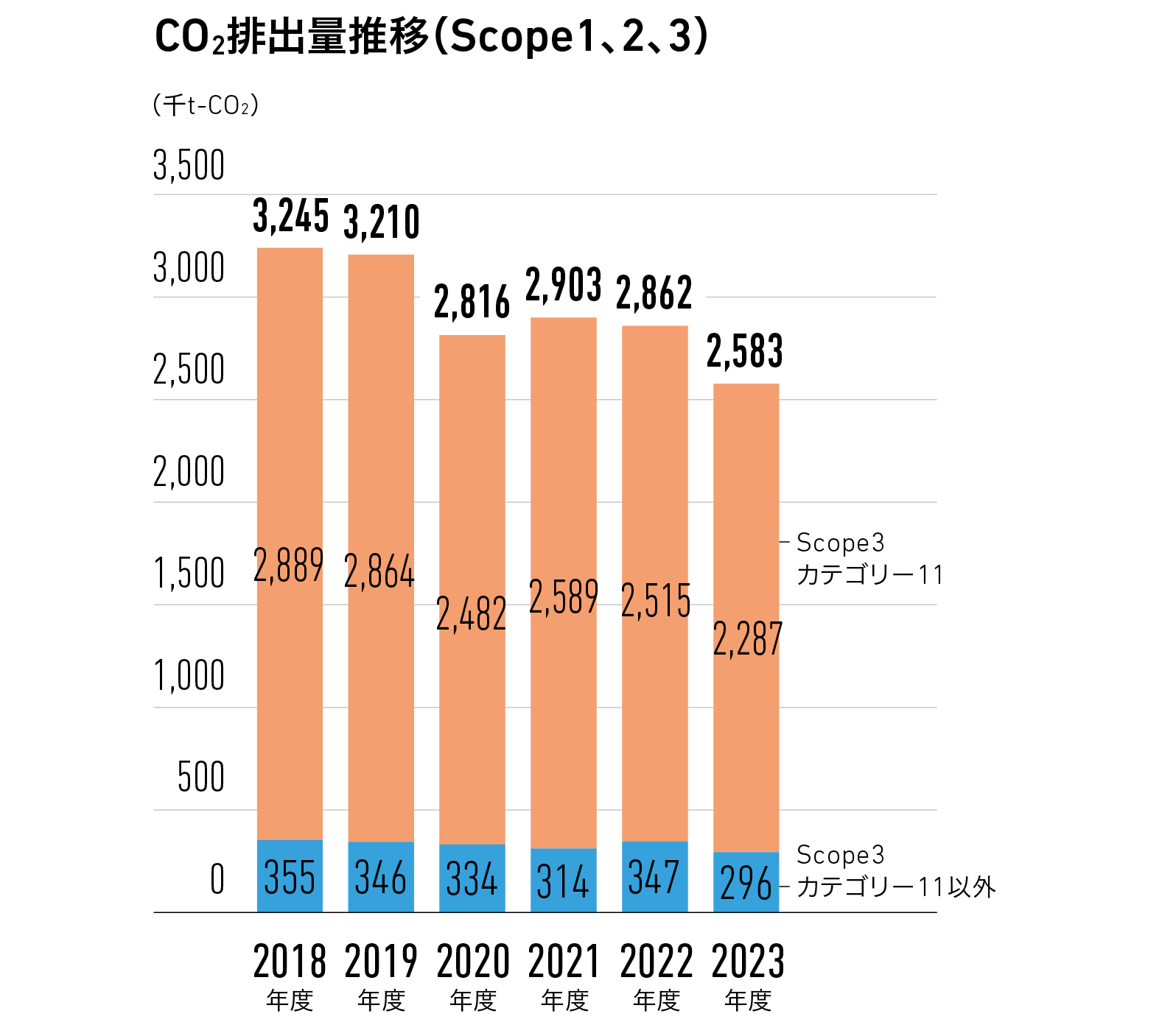 2023年度のCO2排出量は、Scope1(事業による直接排出)は1,710t、Scope2(電力による間接排出)は11,681t、Scope3(Scope1、2以外の間接排出(事業者の活動に関連する他社の排出))は2,569,525tでした。なお、Scope3のうち、カテゴリー11(販売した製品の使用による排出)は2,286,801tでした。