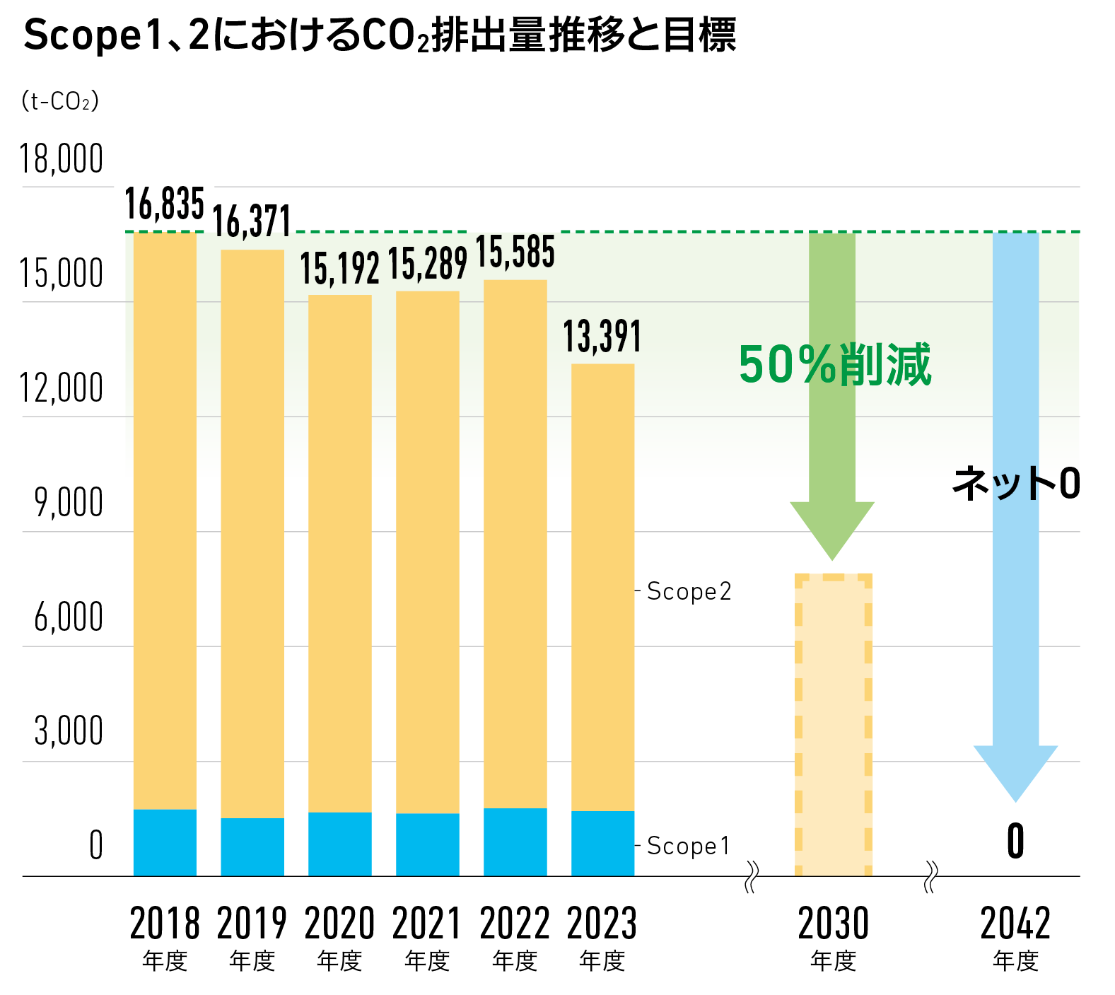 1.2030年にCO2排出量を2018年度比50%削減 2.2042年にCO2排出量ネットゼロ(カーボンニュートラル)を達成 |
