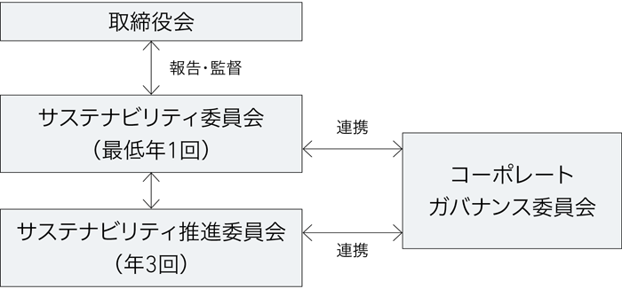 当社は、サステナビリティに関する活動を推進するため、取締役会の監督のもと、サステナビリティ戦略決定機関として、サステナビリティ委員会(委員長:代表取締役社長)を、サステナビリティ委員会の下部組織として、サステナビリティに関する諸活動を推進するサステナビリティ推進委員会(委員長:サステナビリティ担当取締役)を設置しています。