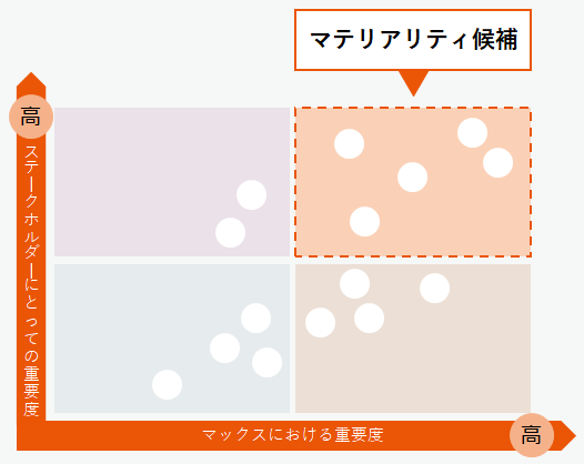 マテリアリティの特定にあたっては、SDGsや国連グローバルコンパクト、ISO26000、GRIスタンダード等の国際的な枠組みや、幅広いステークホルダーの視点と、企業へのインパクトの視点の双方を考慮しました。その上で、役職員向けアンケートの実施、社外役員や外部有識者との意見交換等、社内外で積極的に議論を重ね、取締役会での承認を経て、マテリアリティを特定しました。
