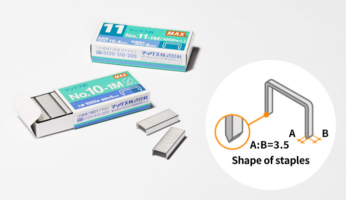 MAX manufactures its staples at its own facilities under meticulous quality control in order to provide the highest quality staples. While producing our staples, we prevent the occurrence of "core deviation," which can cause failure in stapling, and sharpen the tip of the staples to the best angle, so the staples can penetrate through sheets of paper with little effort.