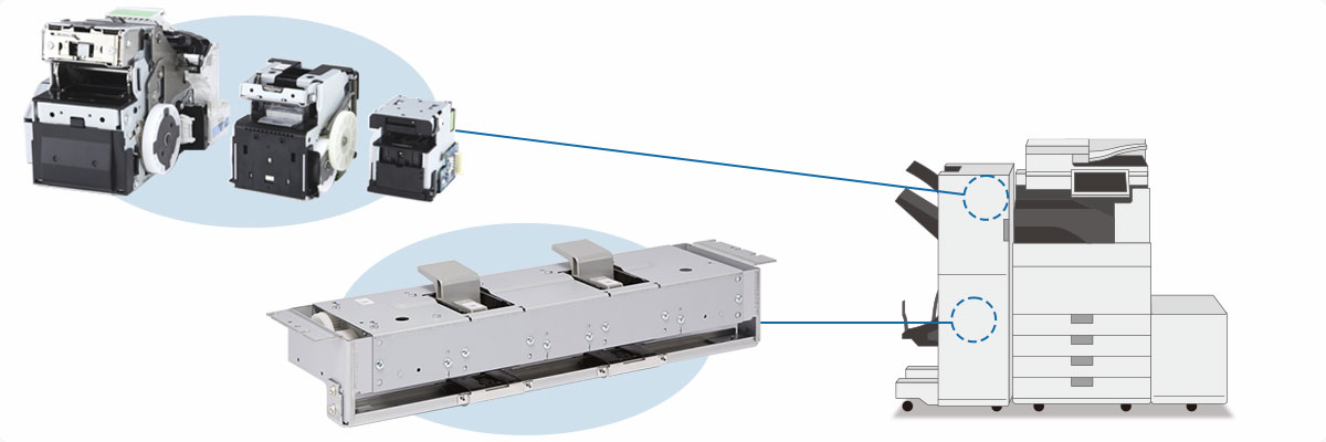 The "auto stapler" has evolved to become a function for stapling printed paper sheets automatically, and the stapling function of the highest capacity model is capable of stapling 100 paper sheets. Also, as an additional function, we have improved a leg cutting function, which makes the legs of a staple less noticeable even when the number of stapled sheets is small.