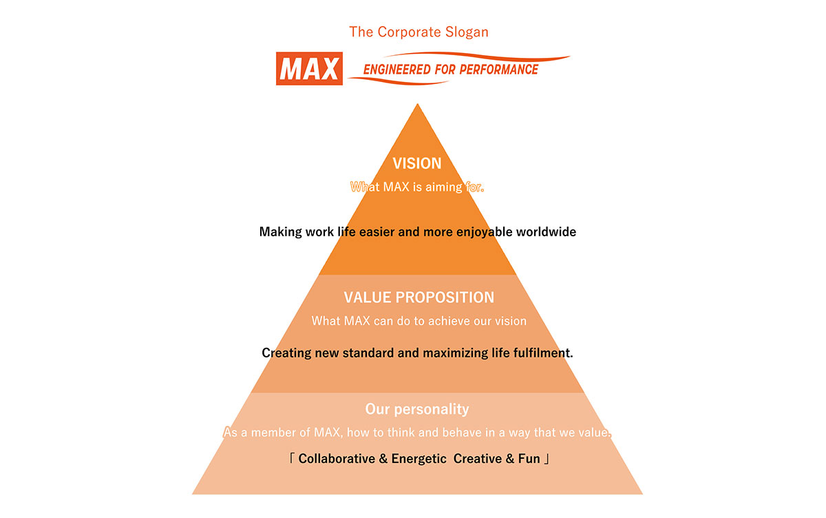 "Engineered for Performance" means that We will continue to create a "new standard" that is valuable to society from the viewpoint of MAX's customers and with our technology, and we will continue to improve the quality of our services. Our goal is not only to maximize the work performance of our customers, but also to maximize the potential of the lives of the people who use our products through the time and mental space created by our products.This is our promise to our customers to not only maximize their work performance, but also to maximize the potential of their own lives through the time and peace of mind that is created.