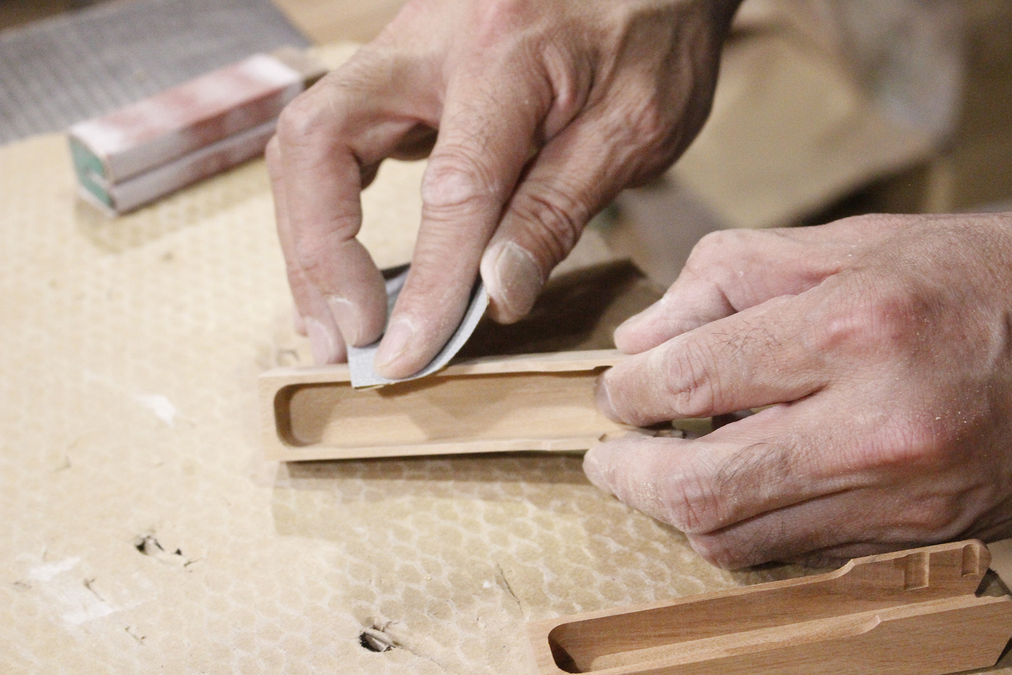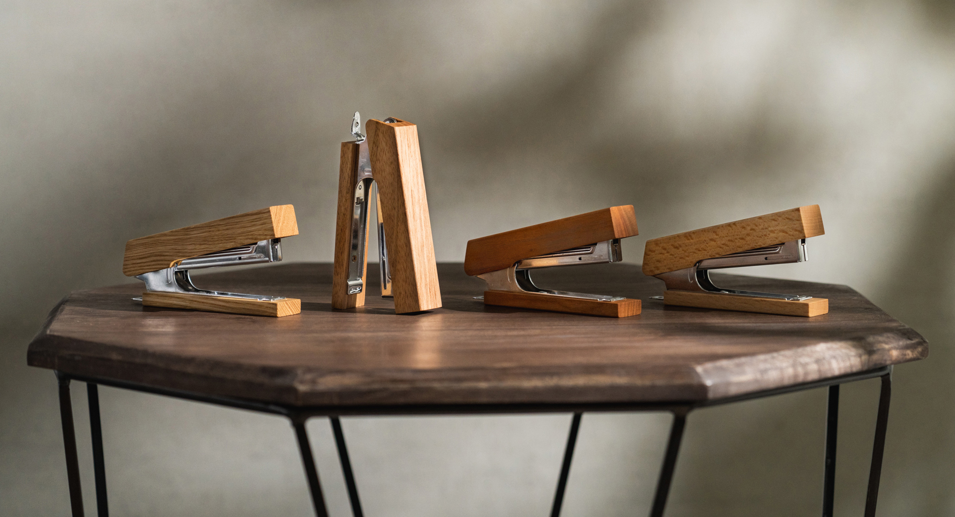 This product was jointly planned with furniture&lifestyle factory and kochi, which are located in Takayama City, Gifu Prefecture, an area with a vibrant woodworking industry. The wood materials provided by furniture&lifestyle factory come from broad-leaved trees in the forests of nearby Hida Takayama, with scraps left over from furniture manufacturing upcycled into staplers. The artisans at kochi carefully make each item by hand. Four types of wood are currently being used: mountain cherry, chestnut, walnut, and beech.