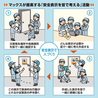 Every year, in Japan, MAX holds a "contest for safety signs and safety awareness training", in which participants use our sign & label printing machine "Bepop" to reduce labor accidents. During the contest, participants work together to check dangerous places and create signs to warn about such places. We believe that by having participants do so, they can learn how to solve dangers and issues in their workplace together. The fundamental reason for holding this contest is to encourage people to conduct "voluntary" improvement activities, and we believe this reason shares some similarities with our fundamental management policy, which is "to become a group in which everyone can grow together by creating a lively and fun atmosphere." MAX will continue contributing to reducing labor accidents by "creating a workplace with a positive and lively atomosphere."