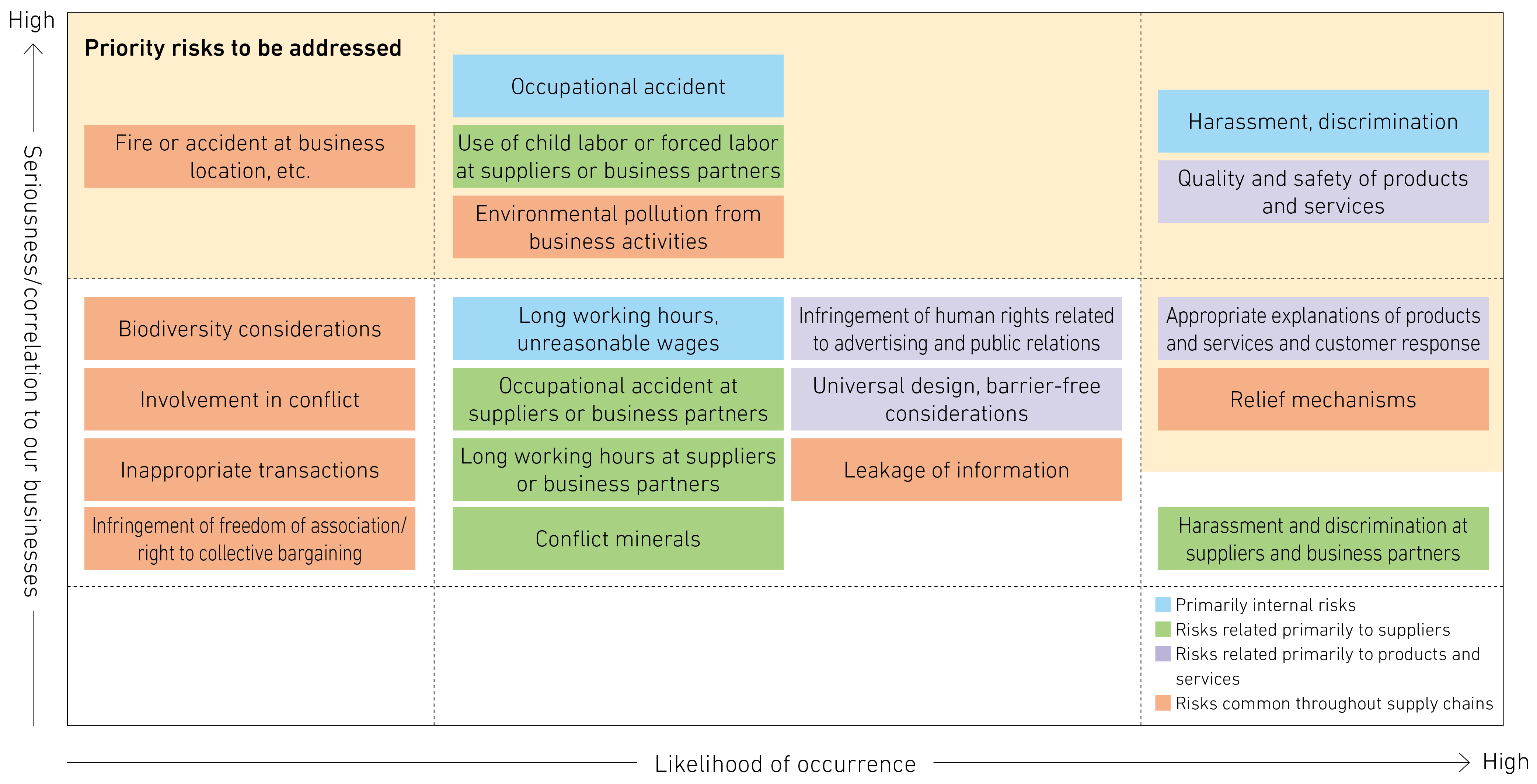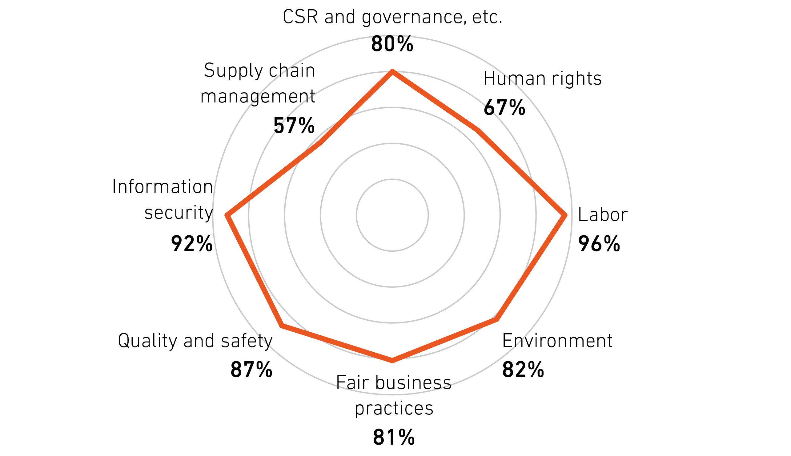 The questionnaires found no major risks that needed to be dealt with urgently. Through the questionnaires, we determined that supplier initiatives had made an especially great deal of progress in the areas of labor and information security. However, the percentage of positive responses was relatively low for the areas of human rights and the supply chain. Specifically, in the human rights area, initiatives tended to be somewhat lacking with respect to human rights due diligence, while in the supply chain area, they tended to be slightly lacking with respect to formulating business continuity plans (BCPs), etc. Also, we determined that some suppliers had made little progress with initiatives for tier 2 suppliers and beyond. Although there were no risks or concerns of suppliers being directly involved in forced labor or child labor, we may not be fully aware of risks or concerns related to tier 2 suppliers and beyond.