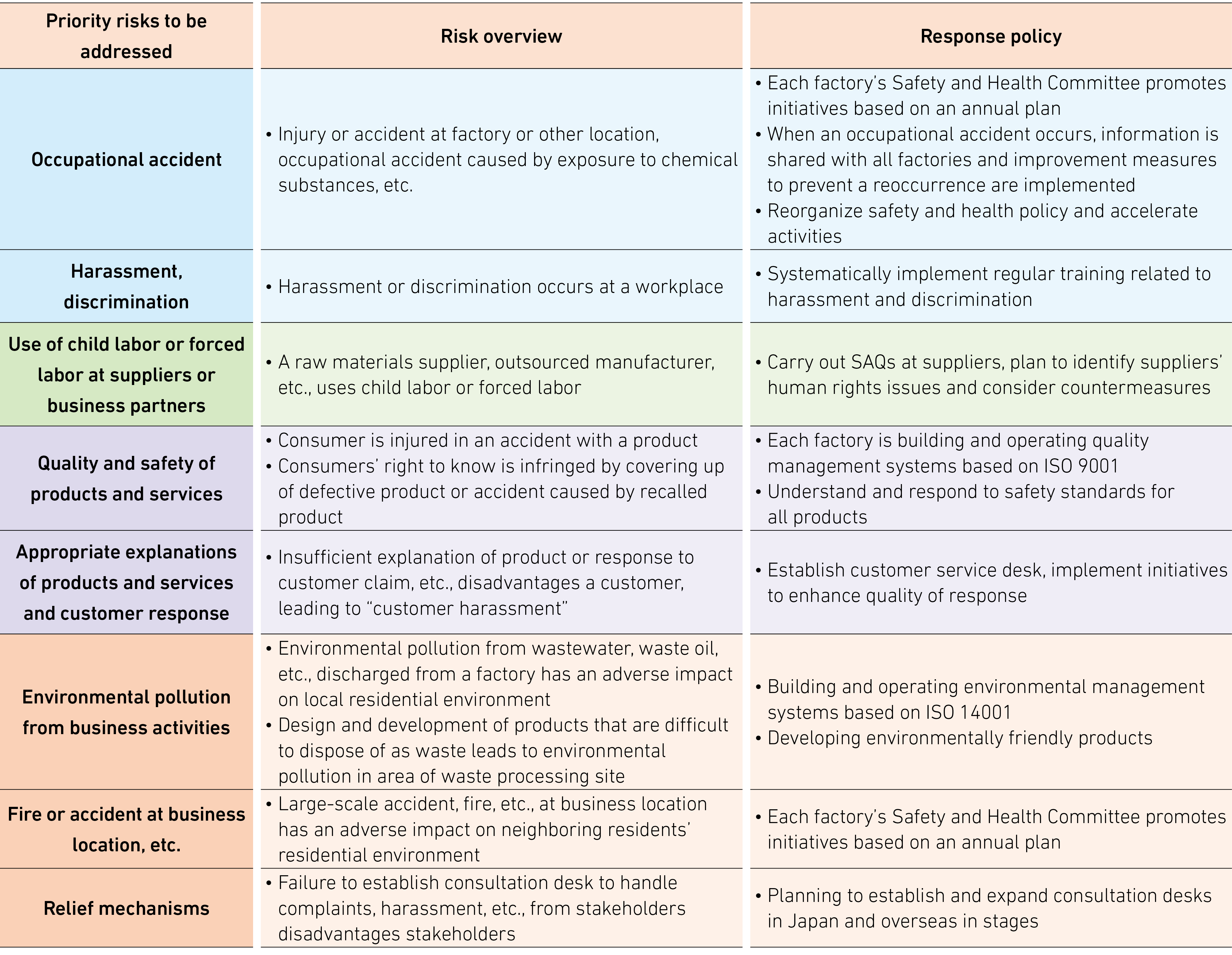 To fulfill our responsibility to respect human rights, the MAX Group is building and implementing a human rights due diligence framework to identify, prevent, and mitigate negative impacts on human rights. In fiscal 2023, the Group identified human rights risks it should prioritize its efforts to address and defined a policy for dealing with these priority risks. In fiscal 2024, selfassessment questionnaires (SAQs) were administered to suppliers to determine the state of human rights risks in the supply chain, including the use of child labor and forced labor throughout the supply chain, which was one of the risks identified as a priority risk.