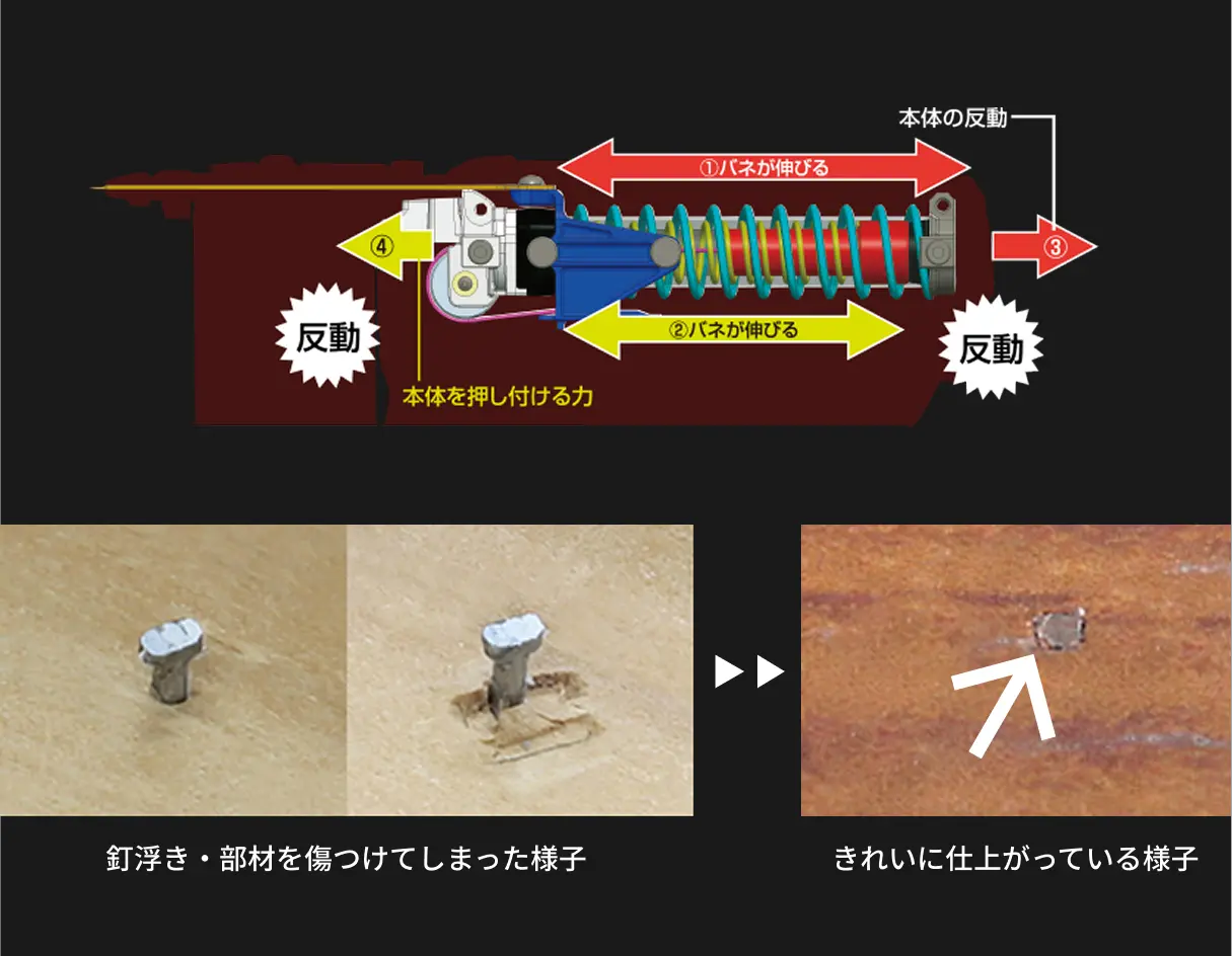 この反動で釘が浮いたり(釘浮き)、機械がぶれて部材を傷つけることもありました。「反動吸収機構」では、機械に内蔵されたウェイトがステープル・ピンネイル・フィニッシュネイルを打ち込む際に、ドライバと逆方向に作動することで、打ち込むときの機械の反動と機械を押し付ける力をお互いに消しあい、打ち込み力が無駄なく部材に伝わります。