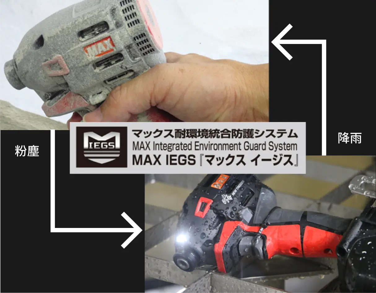 中でも、木くず・コンクリートの粉や突然の雨などへの注意を必要とする製品に対しては、「粉塵試験」と「降雨試験」を繰り返すサイクル試験を行うなど、防塵・防滴に関するマックス独自の規格、「MAX IEGS」に適合させています。
