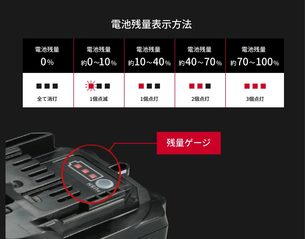 残量確認ボタンを押すと、残量ゲージに電池残量を5段階で表示します。作業開始前や作業中に残量を確認できるため、充電時期の目安にすることができます。