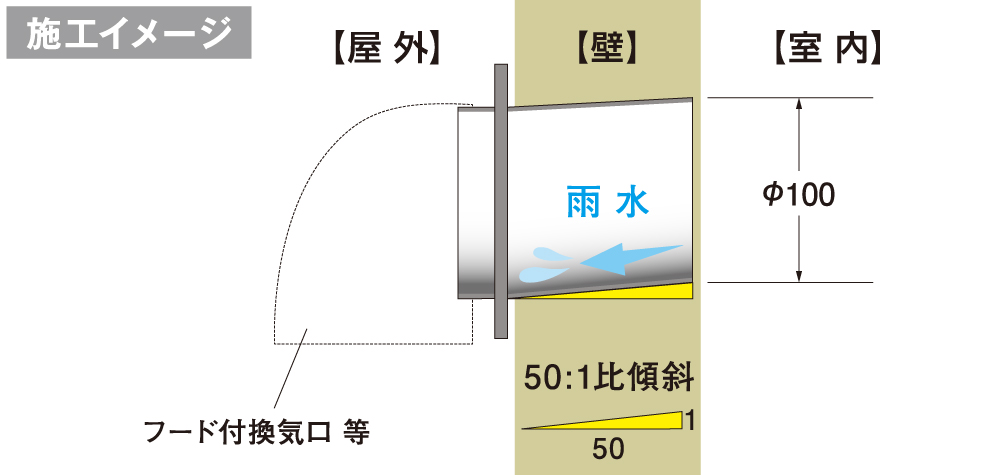 - ※傾斜パイプをφ100ダクトと接続する場合は、φ100用金属ダクト継手をご使用ください。