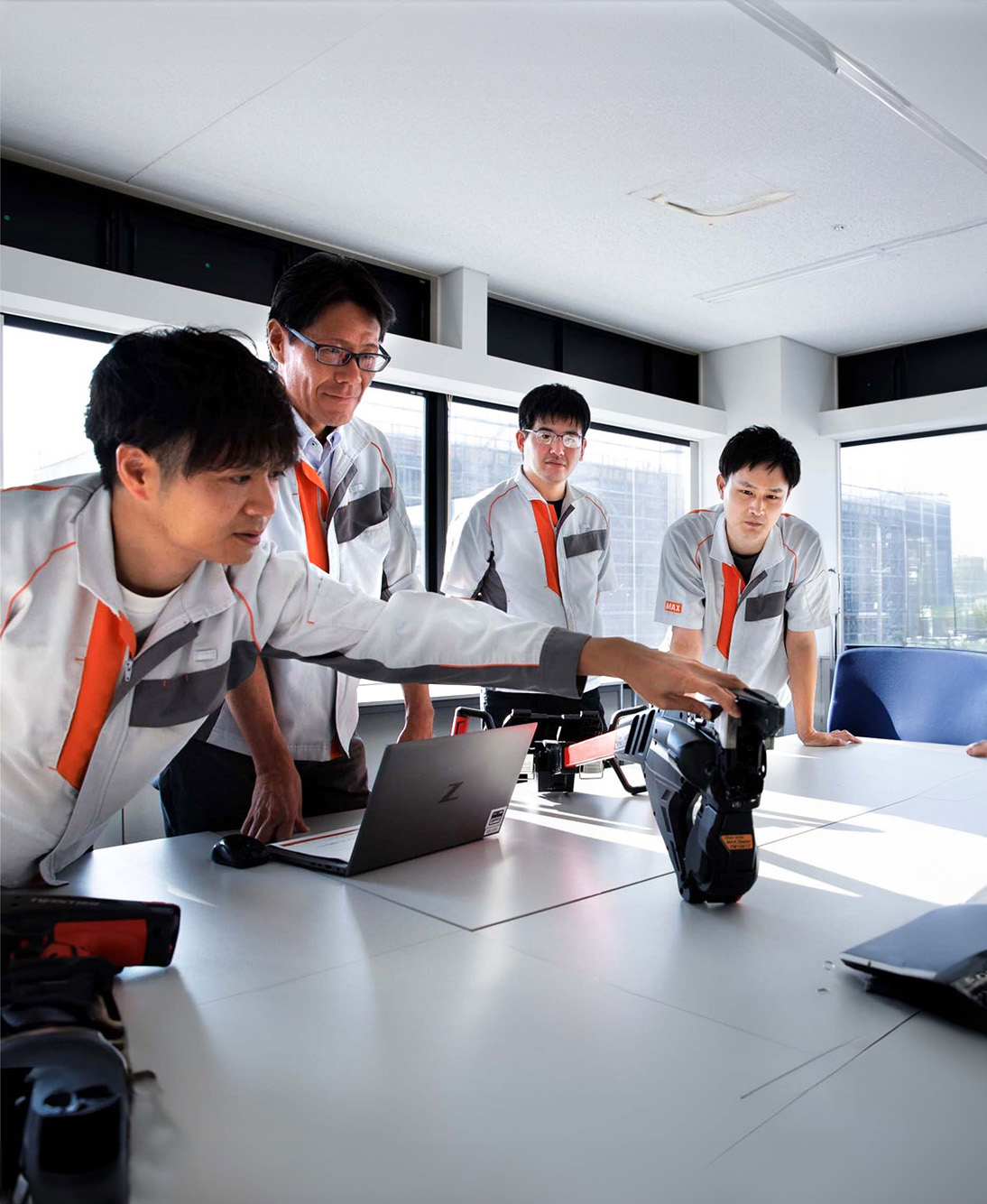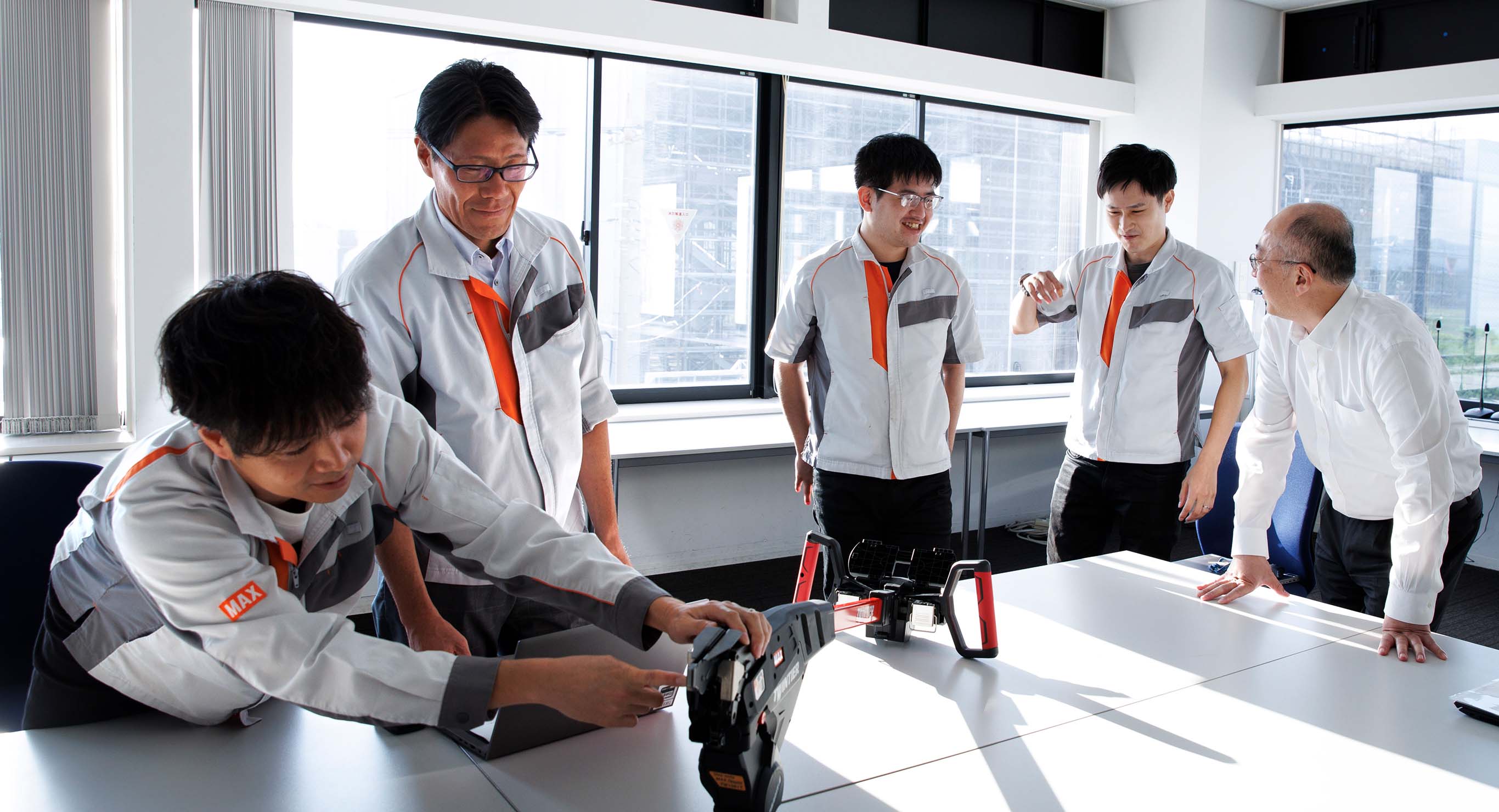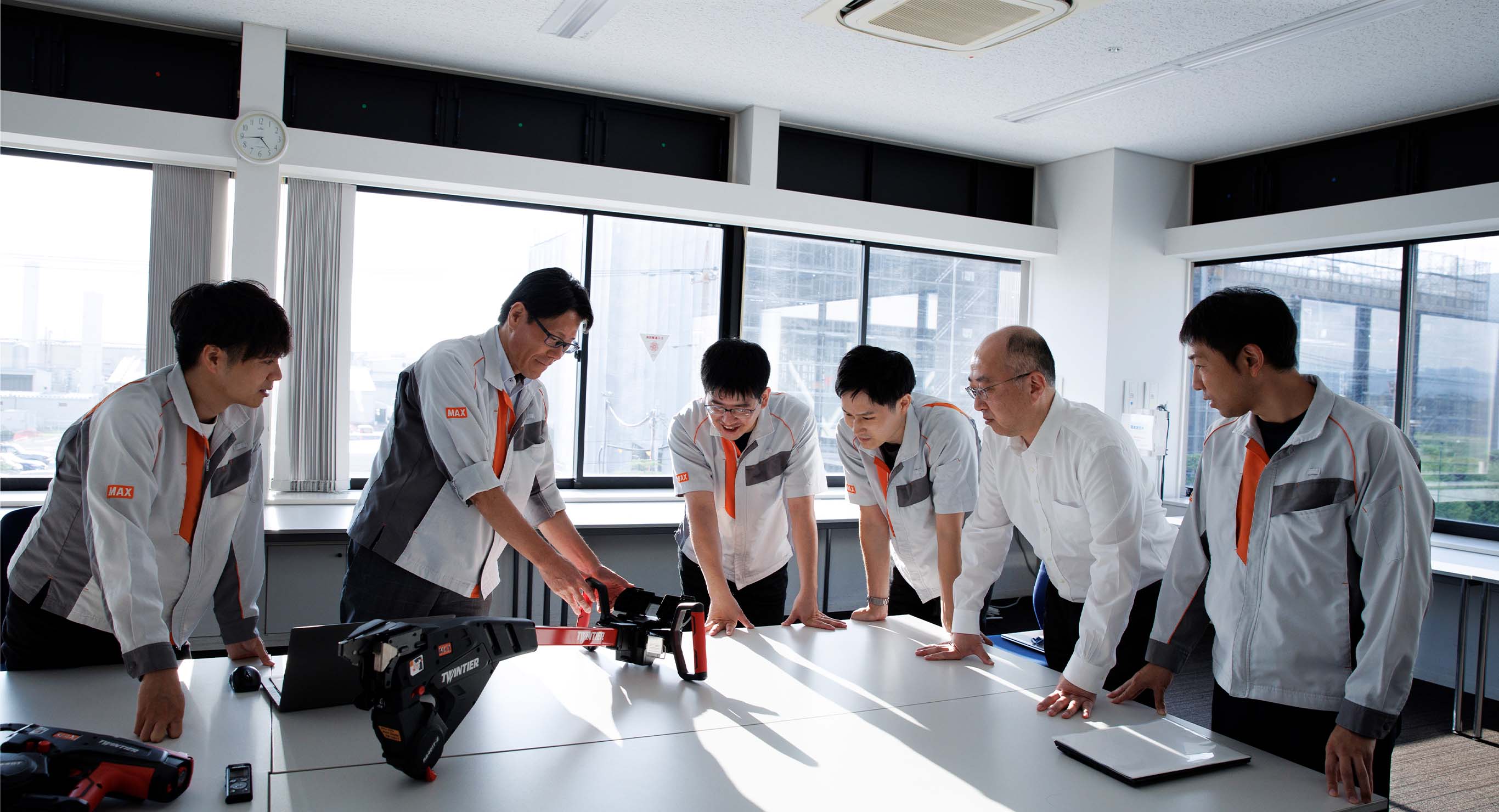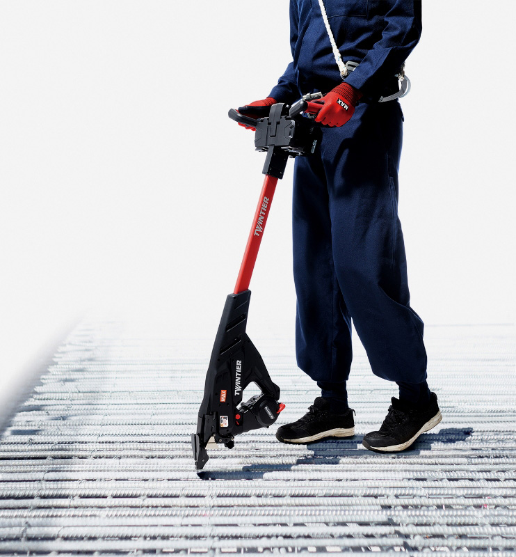 1993年、マックスは世界初の充電式鉄筋結束機を発売し、業界のスタンダードを打ち立てました。主力製品「ツインタイア」シリーズは、大幅な作業効率の向上に貢献し、国内外で多くのお客様に愛用されています。その後継モデル「ウォーカーモデルタイプ」は、現場のニーズに応えながら改良を重ね、身体的負荷を軽減するために腰を曲げない姿勢で結束作業が行えるという、革新的な進化を遂げました。製品がどのように誕生し、発売に至ったのか。現場を大切にするマックスならではの開発ストーリーに迫ります。